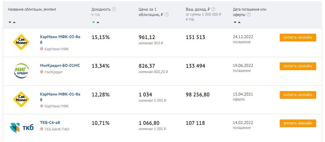 Посмотрите на список облигаций на Banki.ru: максимальная приемлемая доходность — 15%